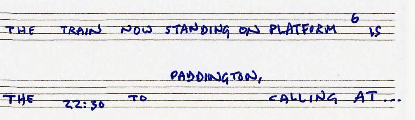 These days, the automated announcements are much clearer, if slightly bizarre to listen to because of the different pitches of the bits that are plugged in to the computer termplate. I’ve tried to represent this on music notepaper: